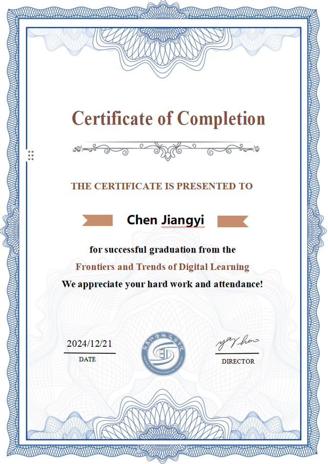 彭洋书记在讲话中指出,《数字化学习前沿与趋势》课程的成功开设,是学院国际化战略的重要成果之一,它为同学们提供了一个与国际顶尖学者直接交流的平台,使大家能够紧跟数字化学习的前沿技术与未来趋势。回顾整个课程,杨浩教授以渊博的学识和深刻的见解,跨越时差为同学们带来了多次精彩的线上授课。课程内容涵盖了数字化学习的背景与发展、工具与资源、人工智能与个性化学习、虚拟现实与增强现实在教育中的应用,以及数据驱动的学习分析等多个前沿话题。这些话题不仅让同学们领略到了数字化学习的广阔天地,也激发了他们对数字化学习的浓厚兴趣和探索精神。