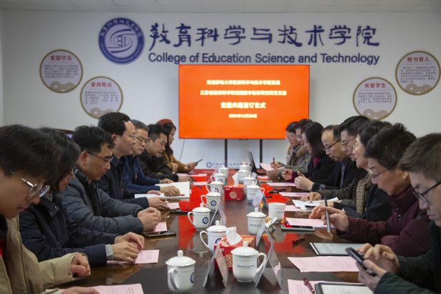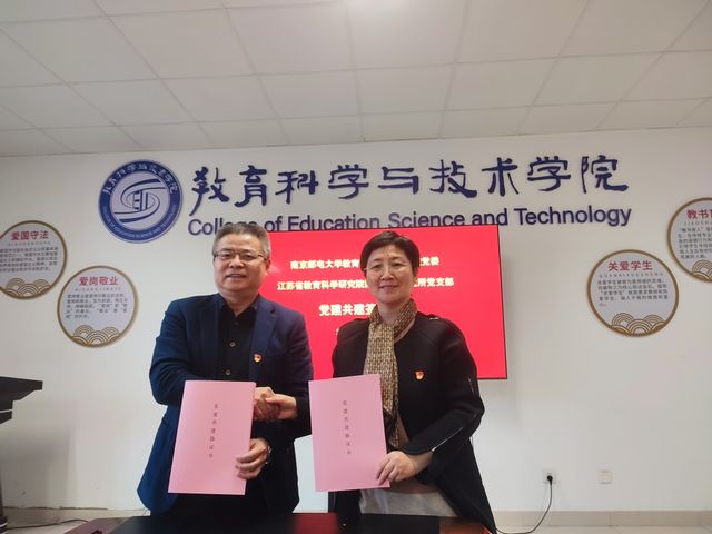 共建双方首先参观南京邮电大学通信展览馆及战邮广场。在党建共建仪式上,学院党委书记彭洋对王从庆副院长一行的到来表示热烈欢迎。学院卢锋院长介绍了学院的历史沿革、师资队伍、人才培养、课程教学、科研成果、党建引领等情况的发展情况。江苏省教育科学研究院数字教育研究所赵华所长介绍研究所情况。随后,学院党委书记彭洋和江苏省教育科学研究院数研所所长、支部书记赵华签署了党建共建协议。